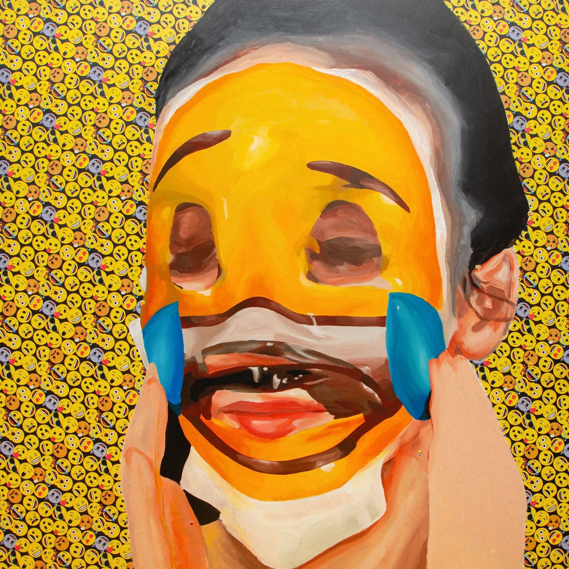 Chorrindo, 2019. Acrílica sobre tecido estampado de emoji. 100x100 cm.