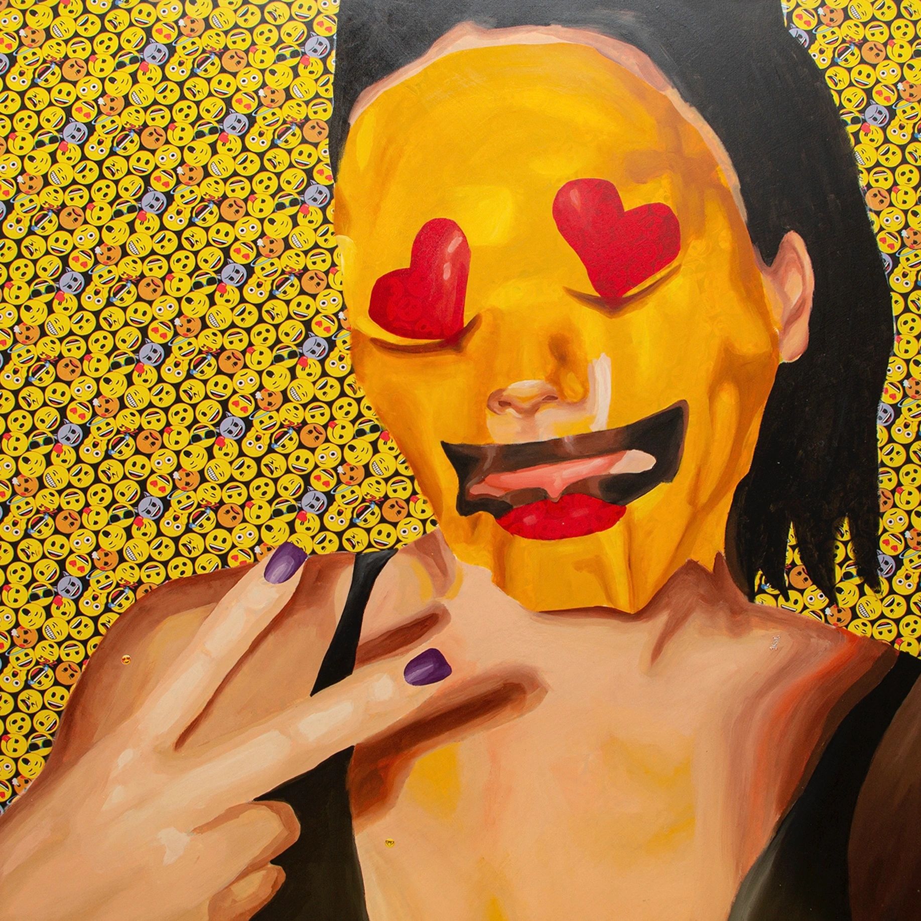 Blogueirinha, 2019. Acrílica sobre tecido estampado de emoji. 100x100 cm.